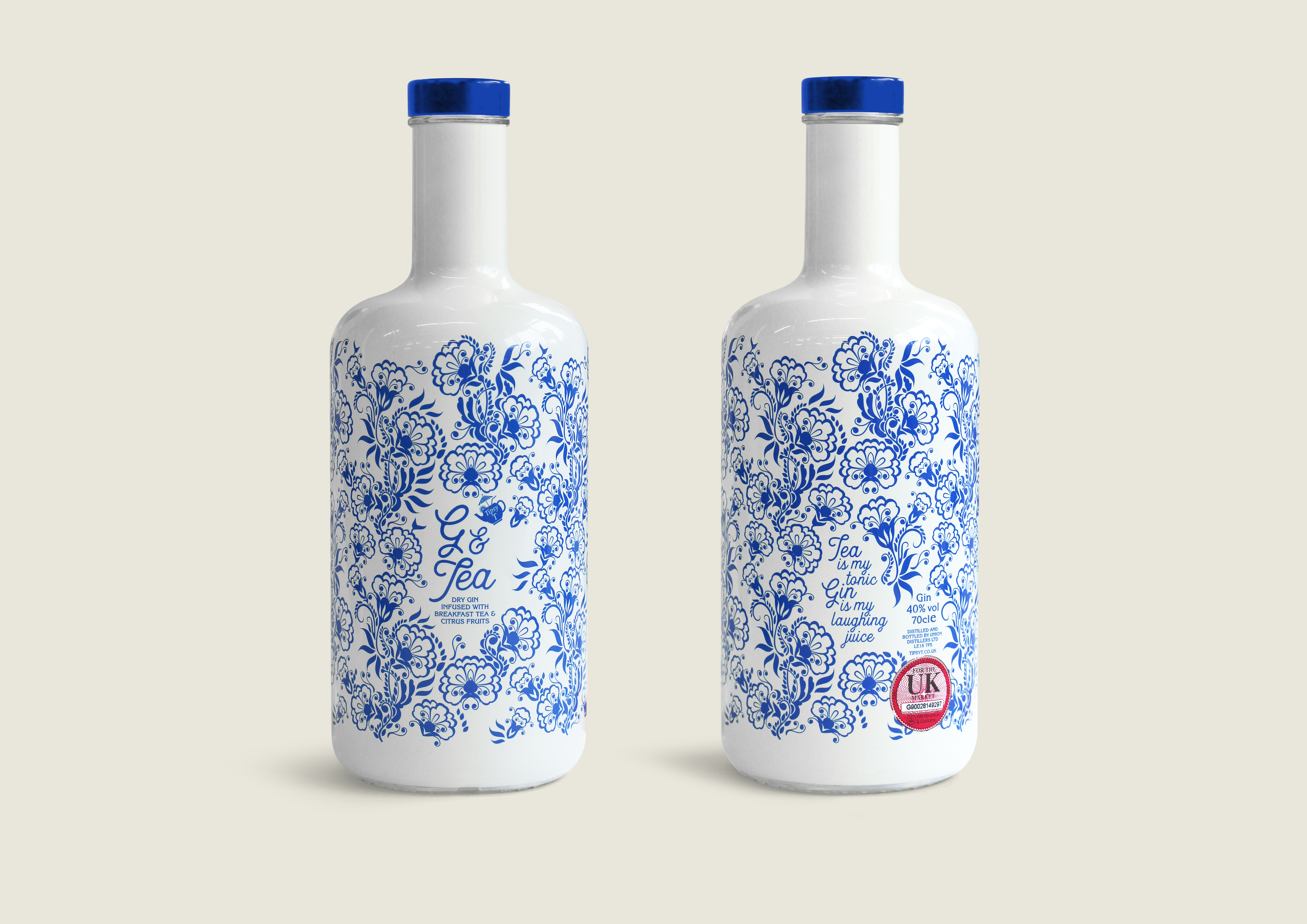 I designed a bottle inspired by classic blue-glazed teapots—so it looked like china, not glass. The finishing touch? The line, I couldn’t resist adding the client’s mantra ‘tea is my tonic, gin is my laughing juice’.